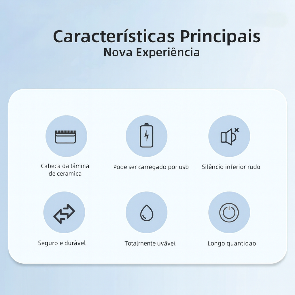 Equipada com lâminas de cerâmica afiadas, não corta a pele, apenas os pêlos, garantindo segurança e praticidade no barbear.