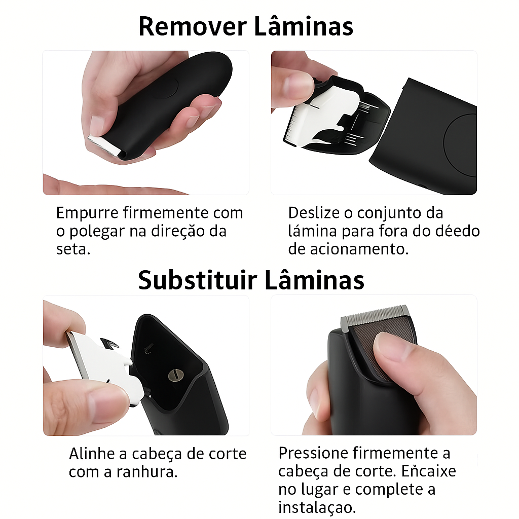As lâminas são amovíveis e podem ser facilmente lavadas com água. Inclui também uma escova para remover os resíduos de pelo.